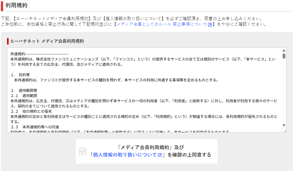 「メディア会員利用規約」及び「個人情報の取り扱いについて」を確認し、「同意」にチェック